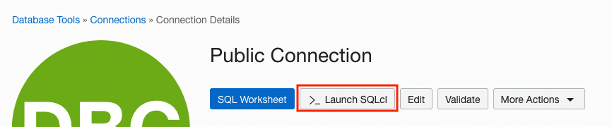The Connection Details page has some valuable features to help you get connected to the database as quickly as possible. You can see the Launch SQLcl button at the top of the page.