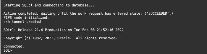 and then proceed to log you into the database with SQLcl via an SSH Tunnel.