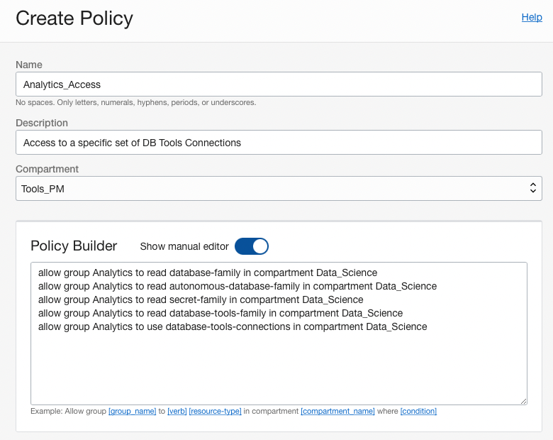allow group Analytics to use database-tools-connections in compartment Tools_PM where target.DatabaseToolsConnection.id = ‘ocid1.databasetoolsconnection.oc1.eu-frankfurt-1.amaaaaaau3i6amaaaaaau3i6amaaaaaau3i6amaaaaaau3i6amaaaaaau3i6’