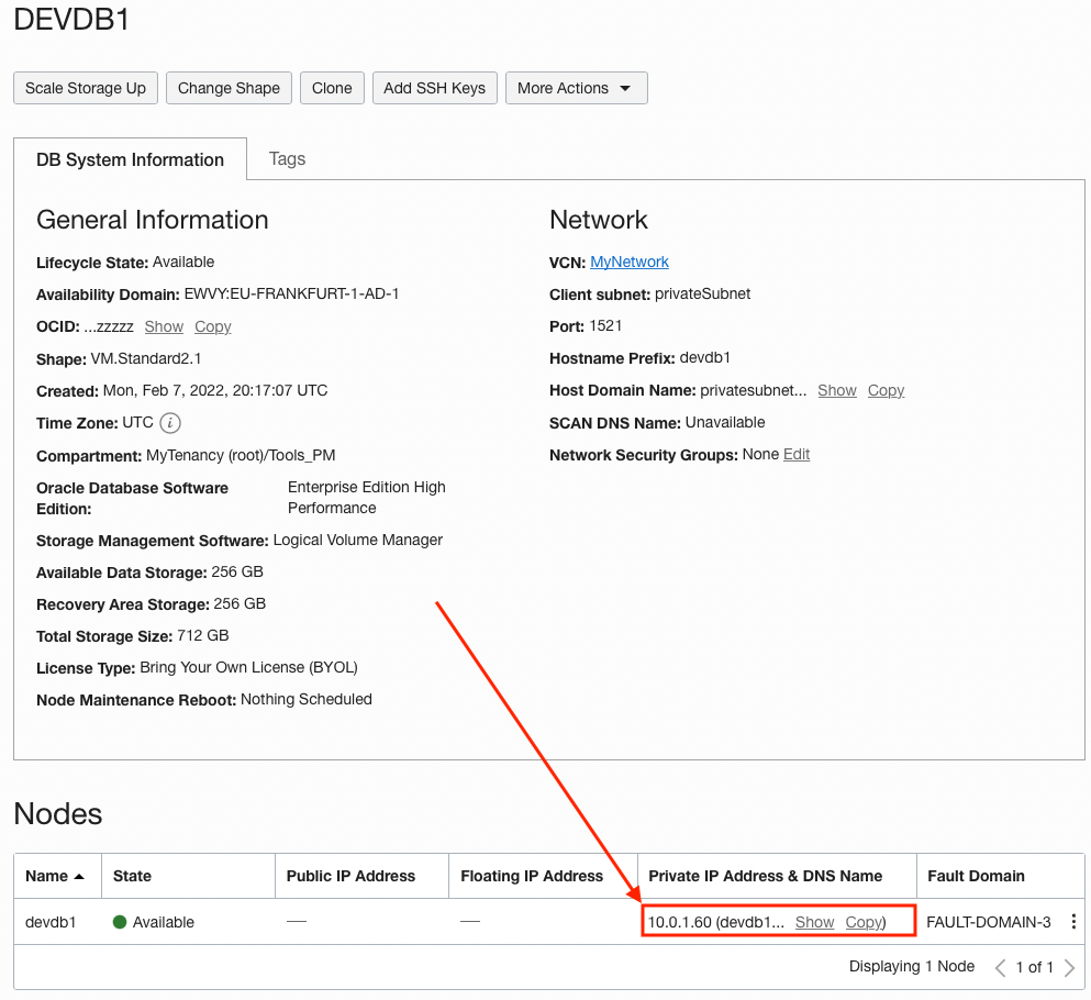 An excellent example of using a Private Endpoint with the Database Tools Service is when you want to connect to a database that is using a private IP address. These databases are usually deployed with multiple layers of security such as hardened Subnet-wide Security Lists and Network Security Groups; configured to only allow communication over a specific port to and from a particular IP address. Looking at this database that was created in a private subnet, it is now assigned the address of 10.0.1.60.