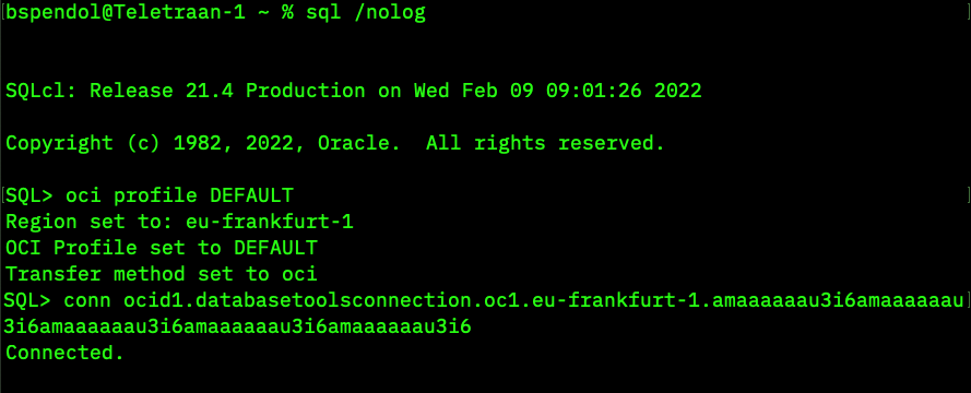 echo “conn ocid1.databasetoolsconnection.oc1.eu-frankfurt-1.amaaaaaau3i6amaaaaaau3i6amaaaaaau3i6amaaaaaau3i6amaaaaaau3i6”