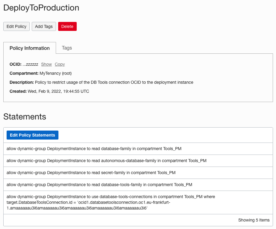 allow dynamic-group DeploymentInstance to use database-tools-connections compartment Tools_PM where target.DatabaseToolsConnection.id = ‘ocid1.databasetoolsconnection.oc1.eu-frankfurt-1.amaaaaaau3i6amaaaaaau3i6amaaaaaau3i6amaaaaaau3i6amaaaaaau3i6’