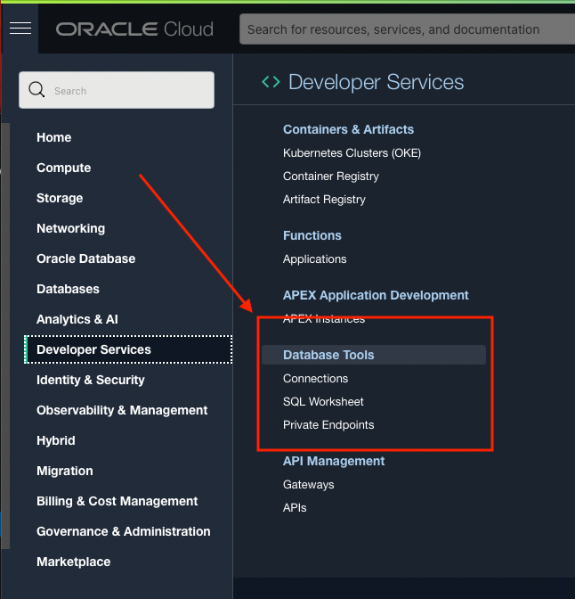 Just click Database Tools in the Developer Services category on the OCI Web Console Menu to get started.