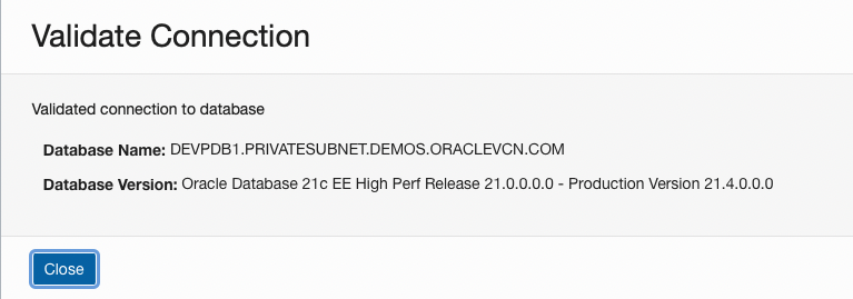 Now, using the Validate button on the Database Tools Connection Details page, we can test the connection and see that we can access the Database.
