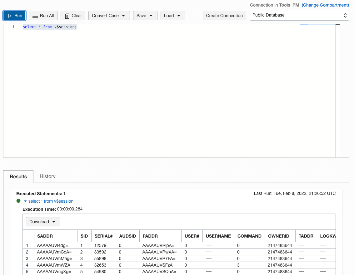 SQL Worksheet is available to use with any Database Connection you have access to use. Run SQL commands right from the OCI console in your browser.