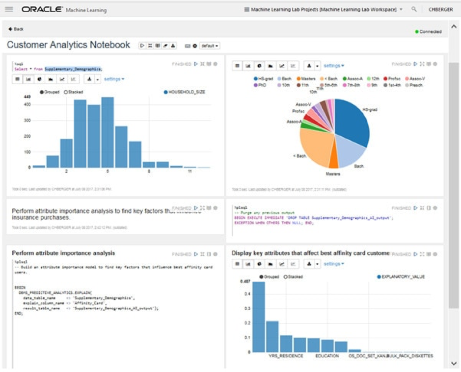 Finally, and this is more of the revolutionary part, Oracle machine learning provides a notebook application designed for SQL users and provides interactive data analysis that lets you develop, document, share, and automate reports based on sophisticated analytics and data models.