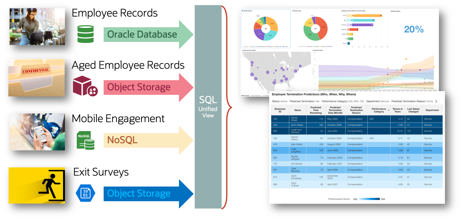 The core HCM application uses the Oracle Database. And, to save money on Exadata storage, they automatically archive data in a cloud object-store. However, with so much turnover, their analysis needed to include historical employee data. The good news was that they were already using Oracle’s hybrid partitioning as an active archive. Even though the data is physically moved, it is still transparently accessed and maintains its metadata, security controls, and audit tracking. This makes historical data easily accessible. Learn more here.