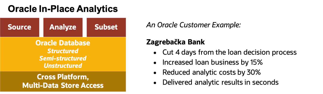 The conventional second step to move the subset into an analytical processing environment. With Oracle, the machine learning environment is already present and integrated across many features of the database engine, such as high performance in-memory processing. This embedded analytics architecture eliminates the data movement step entirely. Data Lakes also don’t have this intrinsic capability.