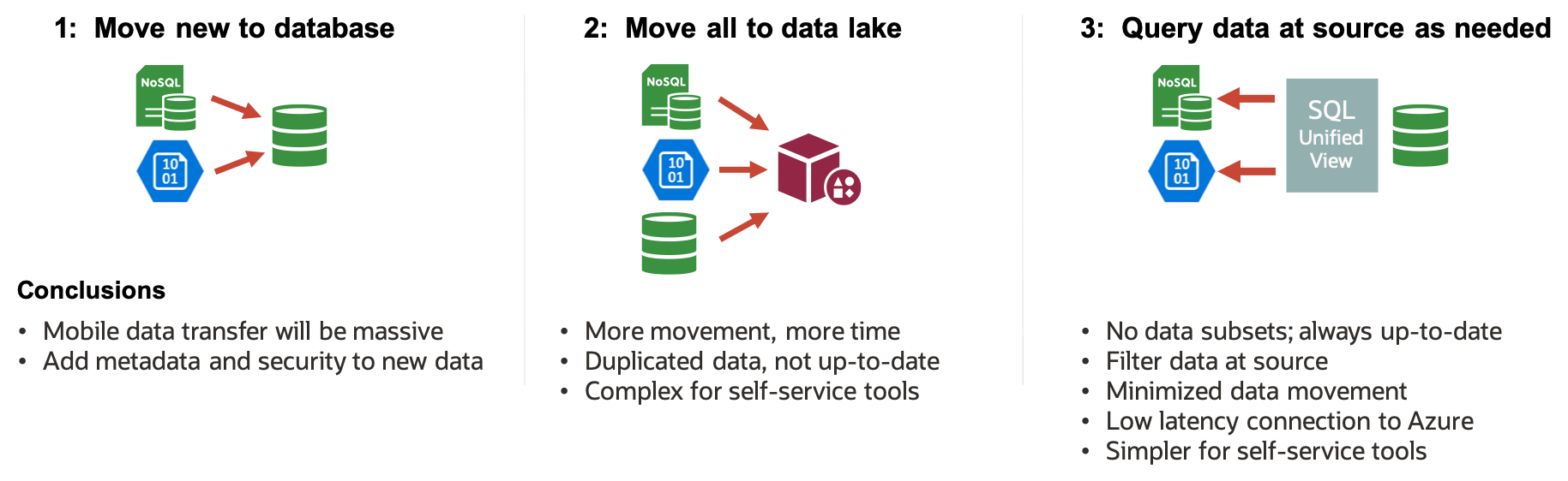 The data scientists added two new data sources for use in our analysis: mobile data in a NoSQL database and survey data in a JSON object-store. With these two sources outside the database, they needed to determine if they could stay true to their data management principle of moving the analytics to the data. Here are the options they considered: