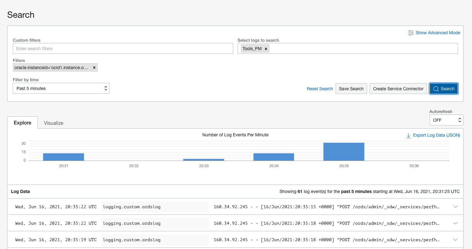 Shortly after the agent is created, you will begin to see logs from the ORDS VM instance appear in this log. The agent is set to tail the log files in the path: /home/opc/ords/conf/ords/standalone/logs/*.log. Your logging path my differ depending on the ORDS logging set up steps.