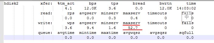 在AIX平台下,iostat的输出中maxserv经常性的大于50毫秒,而这个maxserv代表的是磁盘提供服务的最大服务时间。这个时间大于20毫秒就值得我们警惕了。