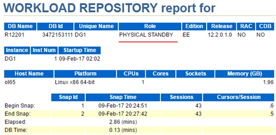 下面是一个ADG库的AWR report的例子,可以看到数据库的Role为PHYSICAL STANDBY。