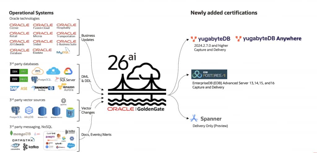 From the outset, PostgreSQL has been a cornerstone of modern data applications: trusted by developers for its extensibility, embraced by enterprises for its reliability, and deployed everywhere from transactional systems to analytically driven platforms. GoldenGate has been part of that journey — as a recognized leader in change data capture (CDC) and replication, relied upon by customers to move data with precision, scale, and operational confidence across heterogeneous landscapes. With the GoldenGate 26ai release, we are significantly expanding that footprint with full capture and delivery support for YugabyteDB and YugabyteDB Anywhere (version 2024.2.7.0 and higher) and EnterpriseDB (EDB) Postgres Advanced Server (version 13 and higher) — delivering data across the most relevant PostgreSQL variants used in today’s architectures.
