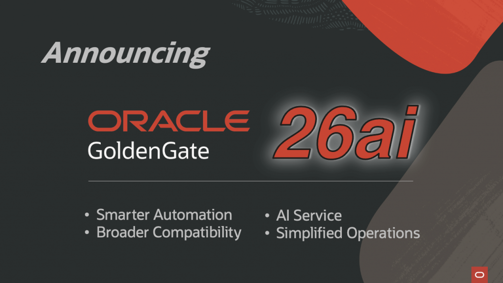 We’re excited to roll out major updates to the GoldenGate platform including: Oracle GoldenGate 26ai (for all major platforms, Oracle, Non-Oracle, Big Data etc.), GoldenGate Stream Analytics 26ai and Veridata 26c available for on-premises and OCI. This release brings a whole new AI Service for GoldenGate deployments, automatic schema evolution, AI Database 26ai support, greatly expanded source/target coverage and an upgraded compare-and-repair experience to simplify enterprise data movement and improve data integrity at scale.