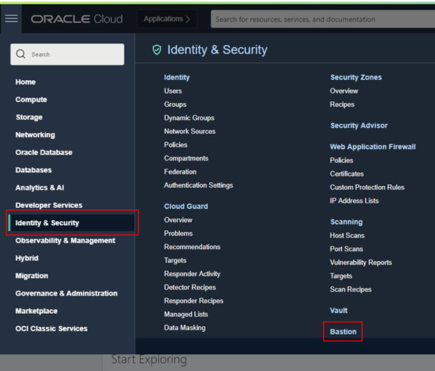 1. Log in to OCI Console. From the navigation menu, click Identity & Security, and then select Bastion.