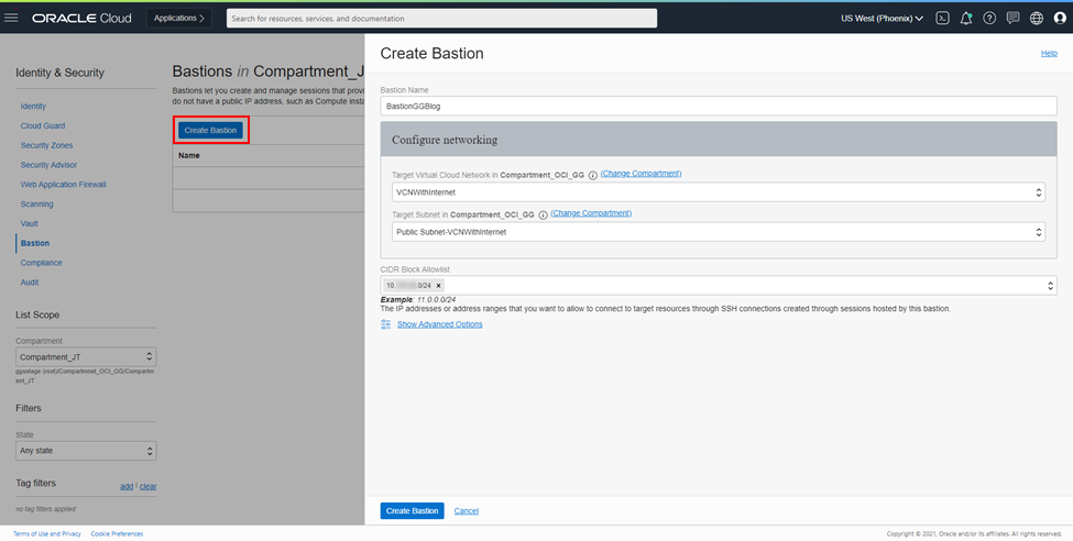 1. In Bastion, select the appropriate compartment, and then click Create Bastion.