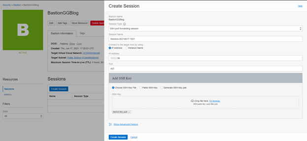 ssh -i <path to private SSH key> -N -L 443:<IP>:443 -p 22 ocid1.bastionsession.oc1.phx….@host.bastion….oraclecloud.com