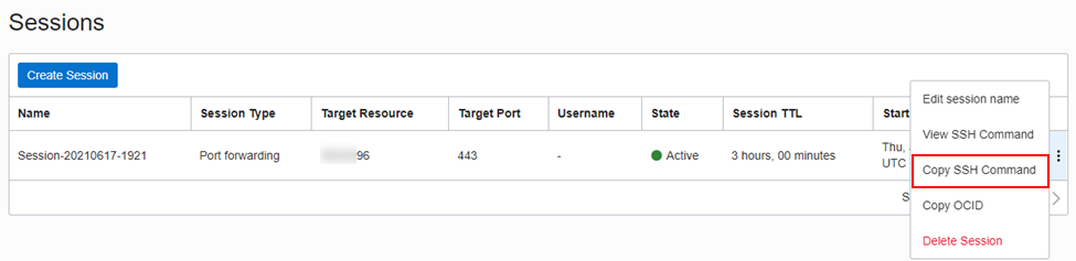 1. After the session is created, from the session’s Actions (three dots) menu, select Copy SSH Command.