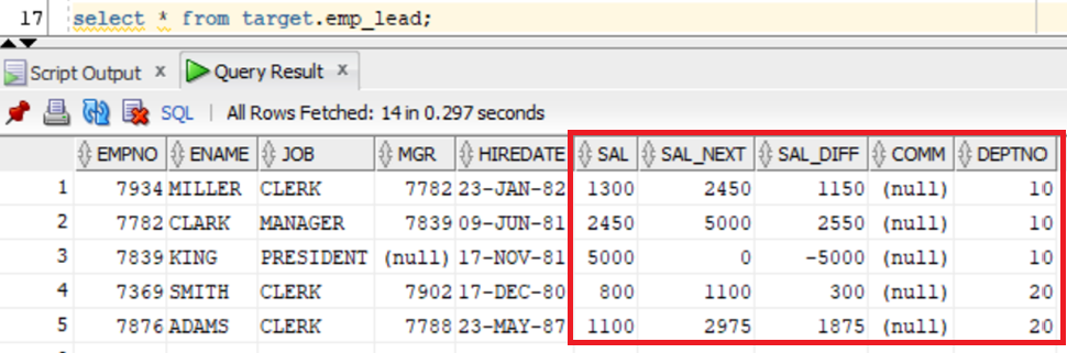 LEAD(EMP_SRC.SAL,1,0) OVER (PARTITION BY EMP_SRC.DEPTNO ORDER BY EMP_SRC.SAL)