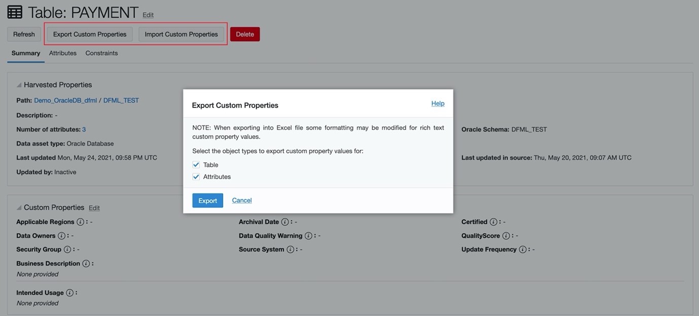 Currently, this feature is available for data assets created using a relational database, such as Oracle Database, Autonomous Database, Microsoft SQL Server, and MySQL. You can export and import custom property values at the schema and data entity levels.