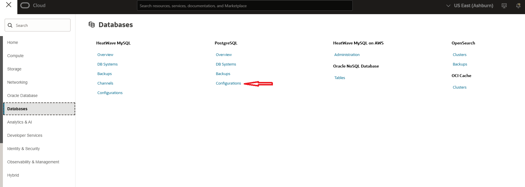 - To create a configuration file, navigate to the OCI Console, open the hamburger menu (☰) in the top-left corner, and go to PostgreSQL > Configurations. This is where you can manage and create custom configuration files for your PostgreSQL DB system.