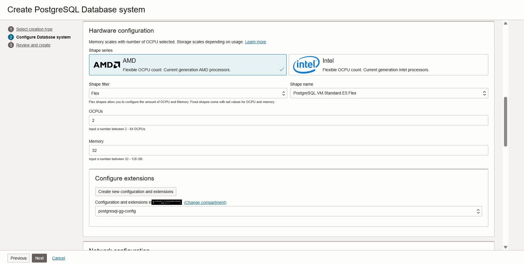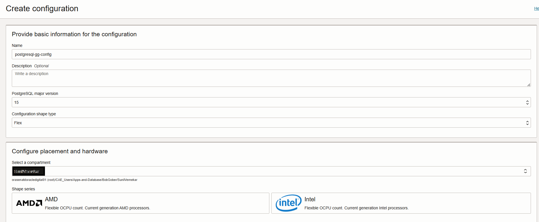 - Next, click on the Create Configuration button. In the configuration setup, provide the name for the configuration and select the major version 15, as Goldengate supports OCI PostgreSQL 15 and above. Choose the appropriate configuration shape type. And Shape Series either AMD or Intel