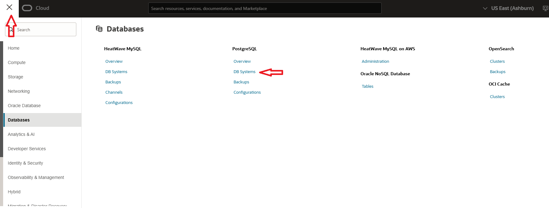 - To create a PostgreSQL DB, navigate to the OCI Console, open the hamburger menu (☰) in the top-left corner, and go to PostgreSQL > DB Systems. This is where you can manage and create your PostgreSQL DB system.