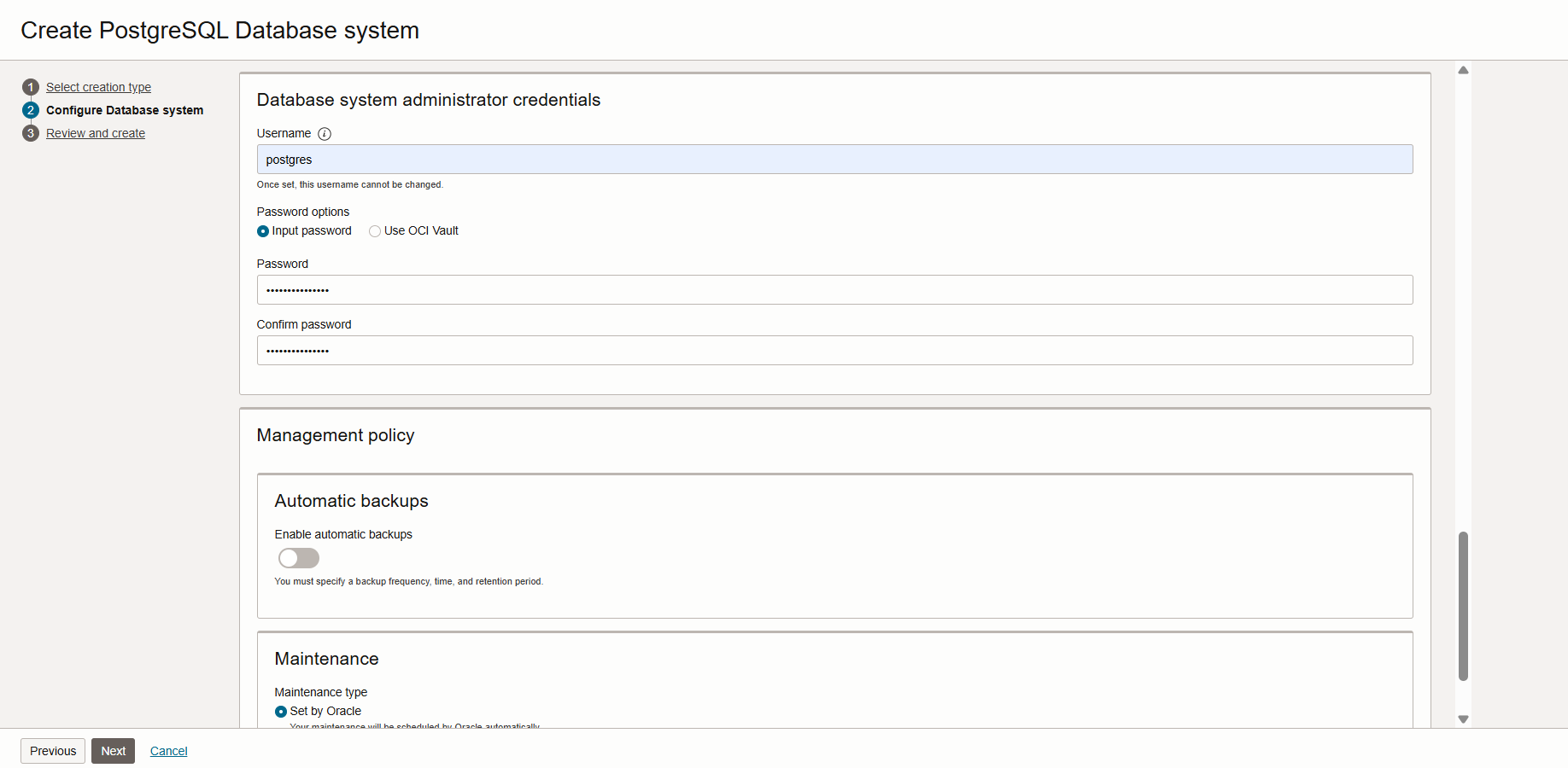 - Next, In the same page fill in the details for Administrator Credentials. Here provide the system username and for password you can either choose to input the system password or choose OCI Vault for the system password.
