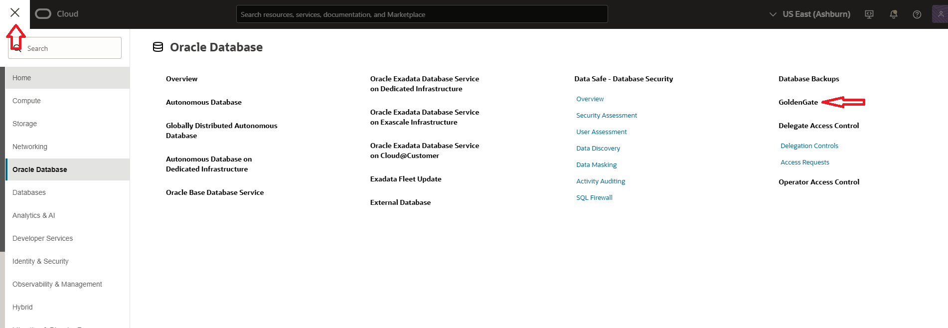 - Now create the connection to the PostgeSQL database from OCI Goldengate. For that to your PostgreSQL database, navigate to the OCI Console, open the hamburger menu (☰), and go to the GoldenGate section.