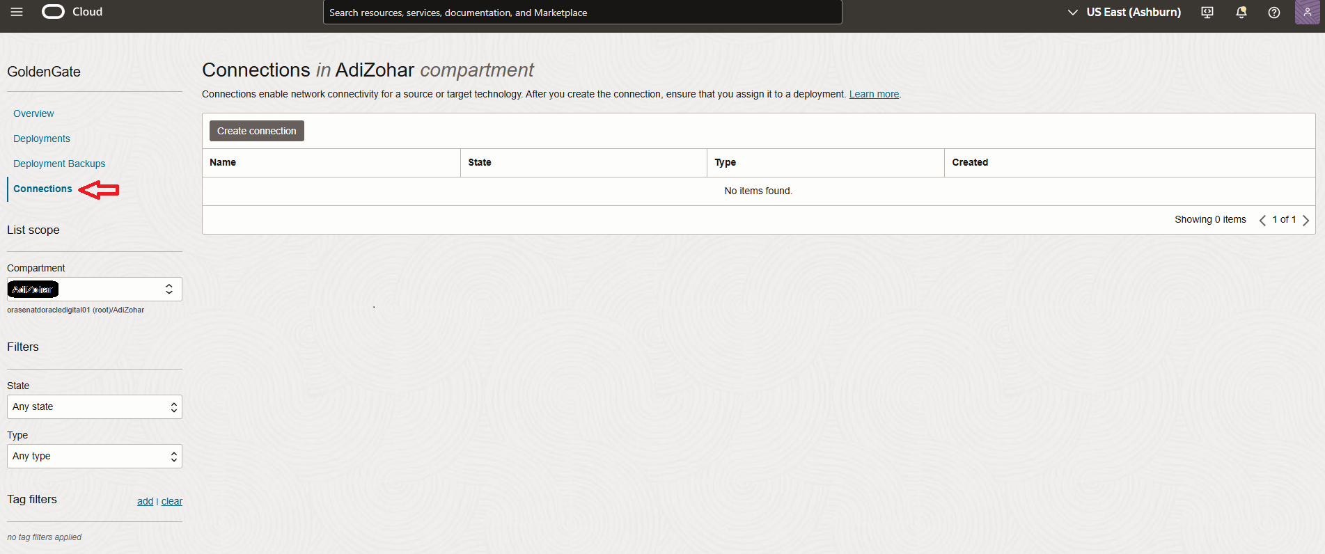 - Next, go to the Connections section within the GoldenGate console, and click on Create Connection.