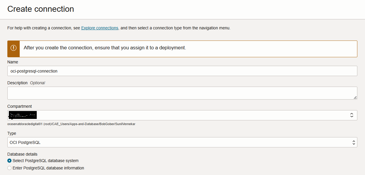 Before creating the connection to OCI PostgreSQL DB, you should have a OCI Goldengate for PostgreSQL deployment created and ready. Below is the documenation on how to create a OCI Goldengate deployment.
