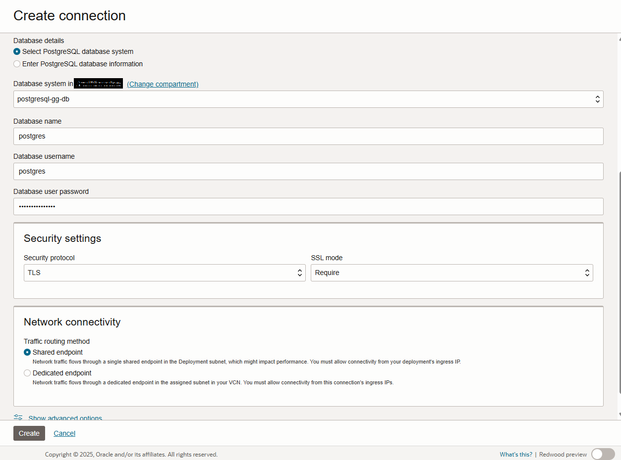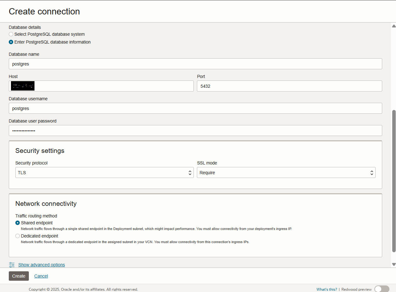 In Database name, provide your database name in PostgreSQL DB System. When you created the PostgreSQL DB System in Step 2 for that, the default database name is postgres.