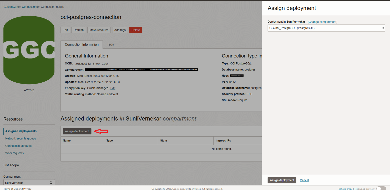 - Next, click on the created connection and assign it to your OCI Goldengate deployment.