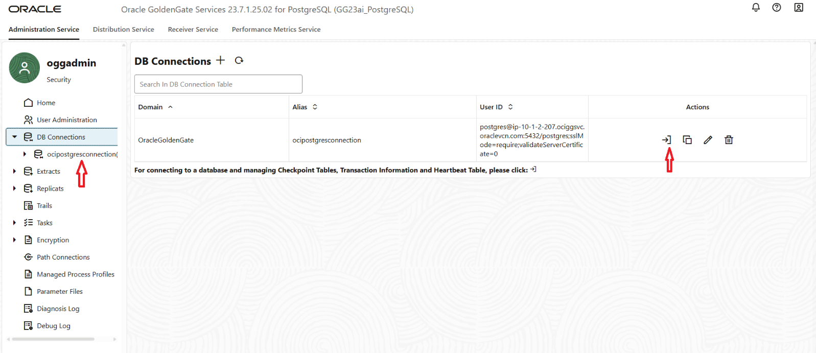 After logging into the OCI GoldenGate Console, navigate to the DB Connections section. Here, you’ll see all the database connections associated with this GoldenGate deployment—set up earlier in Step 3, and then click on connect button.
