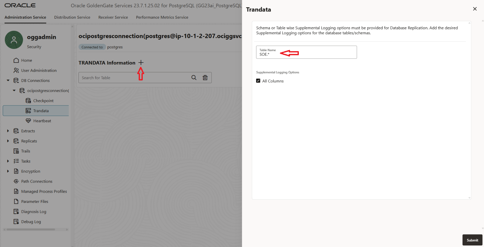 - Next, navigate to the Trandata section in the OCI GoldenGate console. Click on the “+” (Add Trandata) button and specify the schema(s) that contain the tables you want GoldenGate to capture and submit.