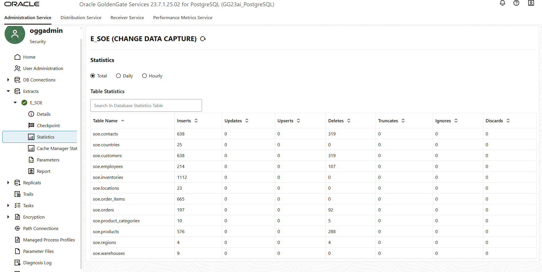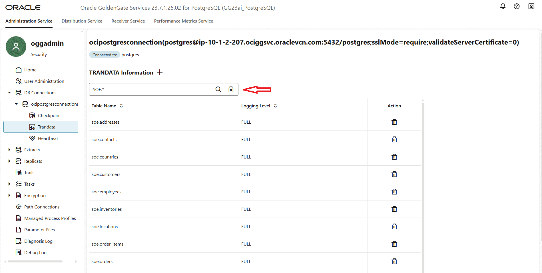 To enable GoldenGate to start capturing changes, the user must be granted the necessary replication privileges. In this example, I’m using the default admin user which is “postgres” for GoldenGate capture.