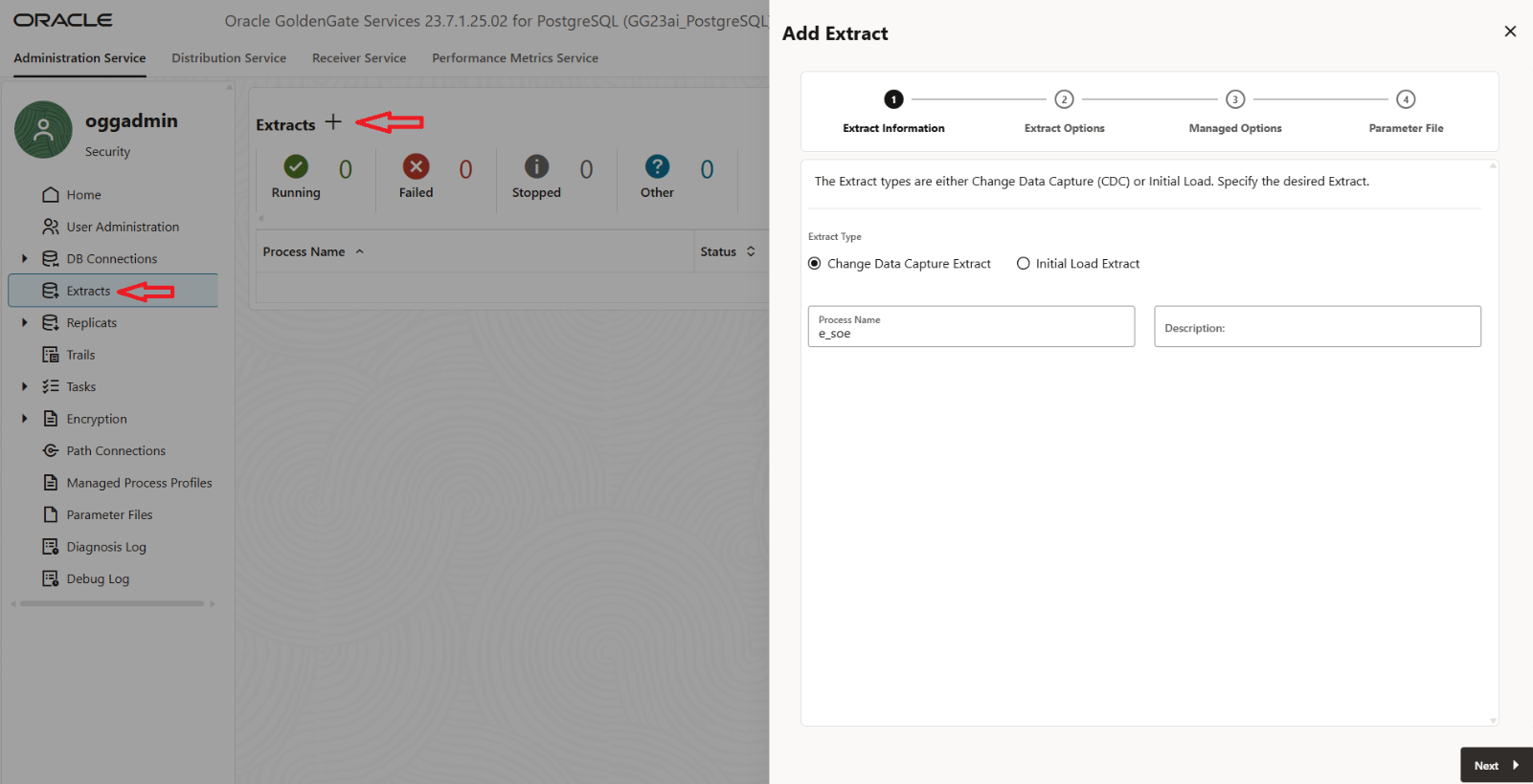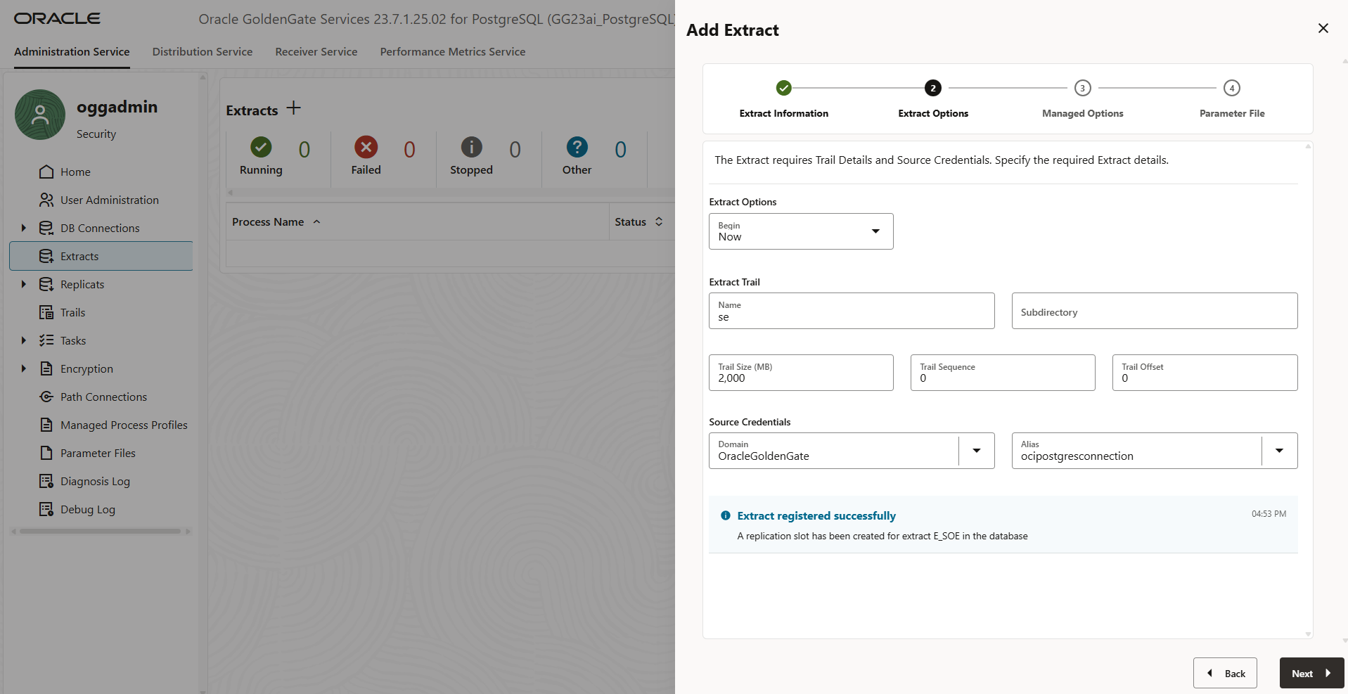 - Create OCI Goldengate Extract on OCI PostgreSQL DB: