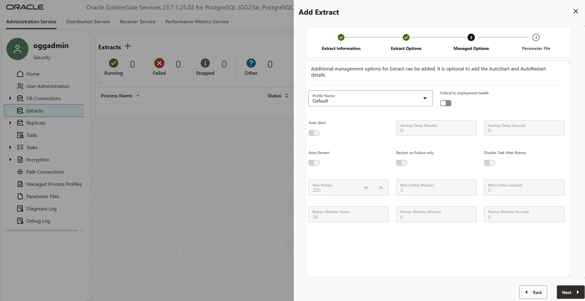 - On the Managed Options page, you can configure additional settings to control how the Extract process behaves within your GoldenGate deployment. Complete the optional fields as needed: