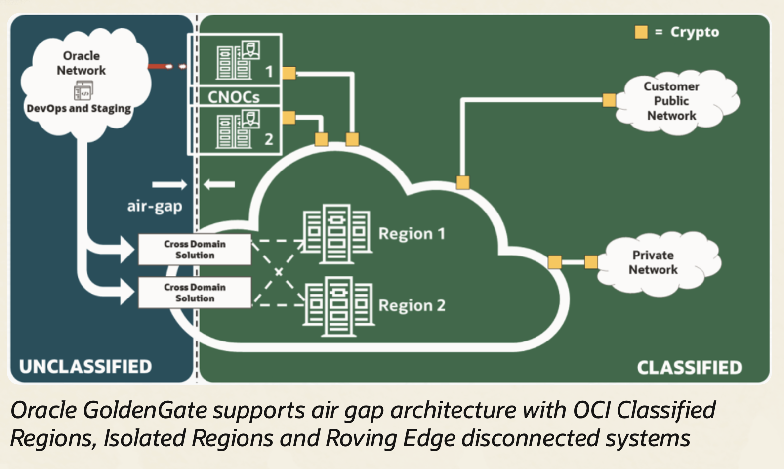- Oracle GoldenGate Data Event Streams for Air Gap Security can be deployed with Oracle Cloud Cross Domain Services in Oracle Defense Cloud and Oracle National Security Regions (ONSRs). These regions adhere to the highest U.S. government security standards, and GDI’s involvement means GoldenGate is ready to operate within them – aligning with government-mandated architectures and connectivity restrictions. Whether the target is an OCI Classified Region or an isolated on-premises network, the GDI team has validated that the GoldenGate solution will function reliably and securely for Government use.