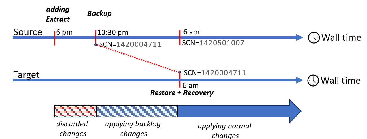 Even though the Replicat process is not started immediately, once it is, it will ignore any changes that occurred before the STARTCSN (the SCN to which the target database was recovered). After that point, Replicat begins applying the backlog of changes. It may take a few hours to catch up, but once it does, replication transitions into the normal, real-time phase.