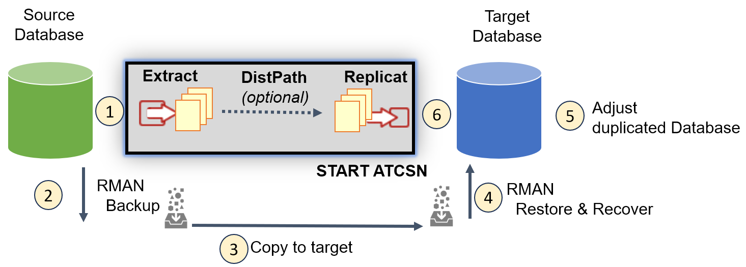 - Oracle Recovery Manager (RMAN) – Creates the target database by restoring a backup of the source database.