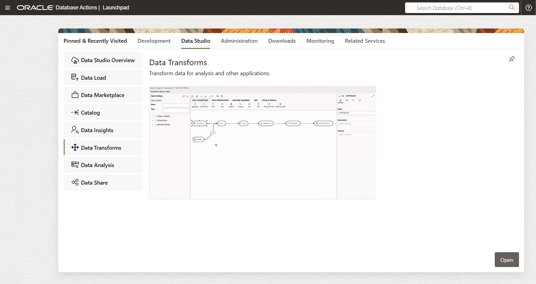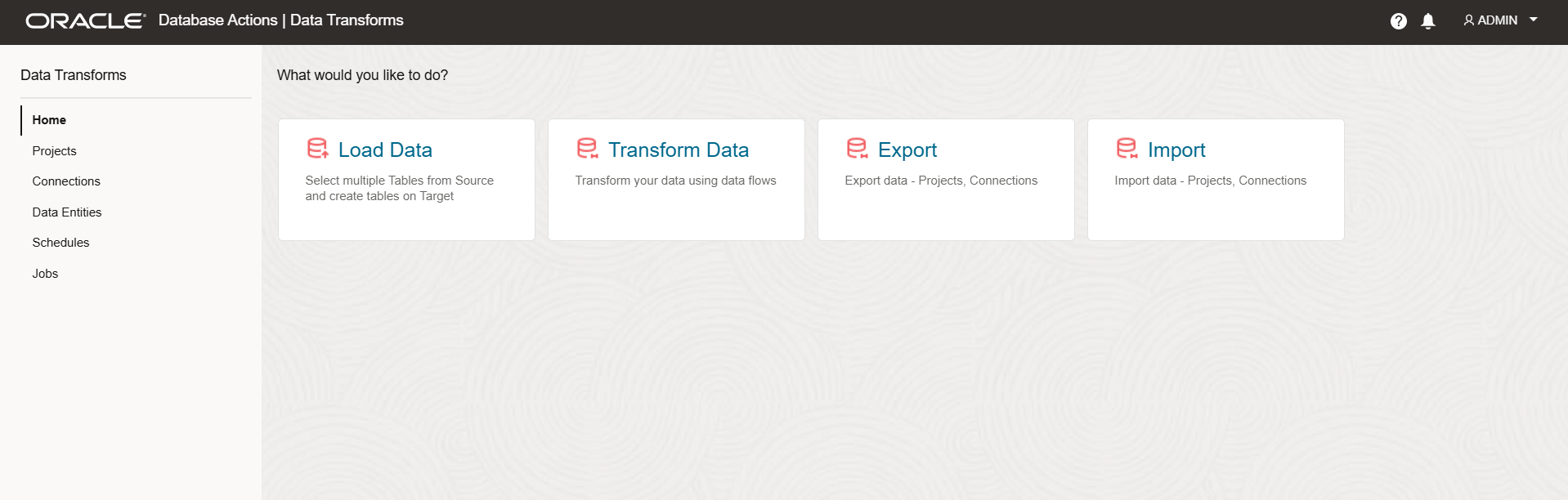 - Autonomous Database Data Tools Page: Navigate to the Autonomous Database Data Tools Page, select Data Transforms from the Database Actions page, or access it via the Data Tools menu.