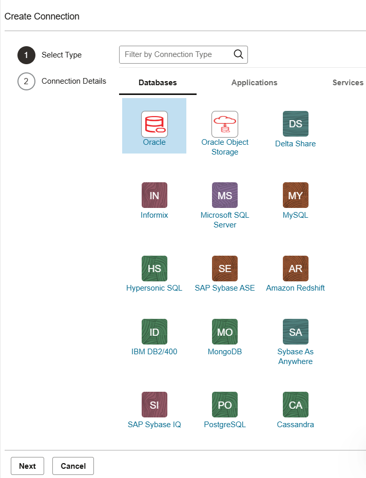 From the home screen, click on Connections in the left-side menu then select the Oracle Database connection type.