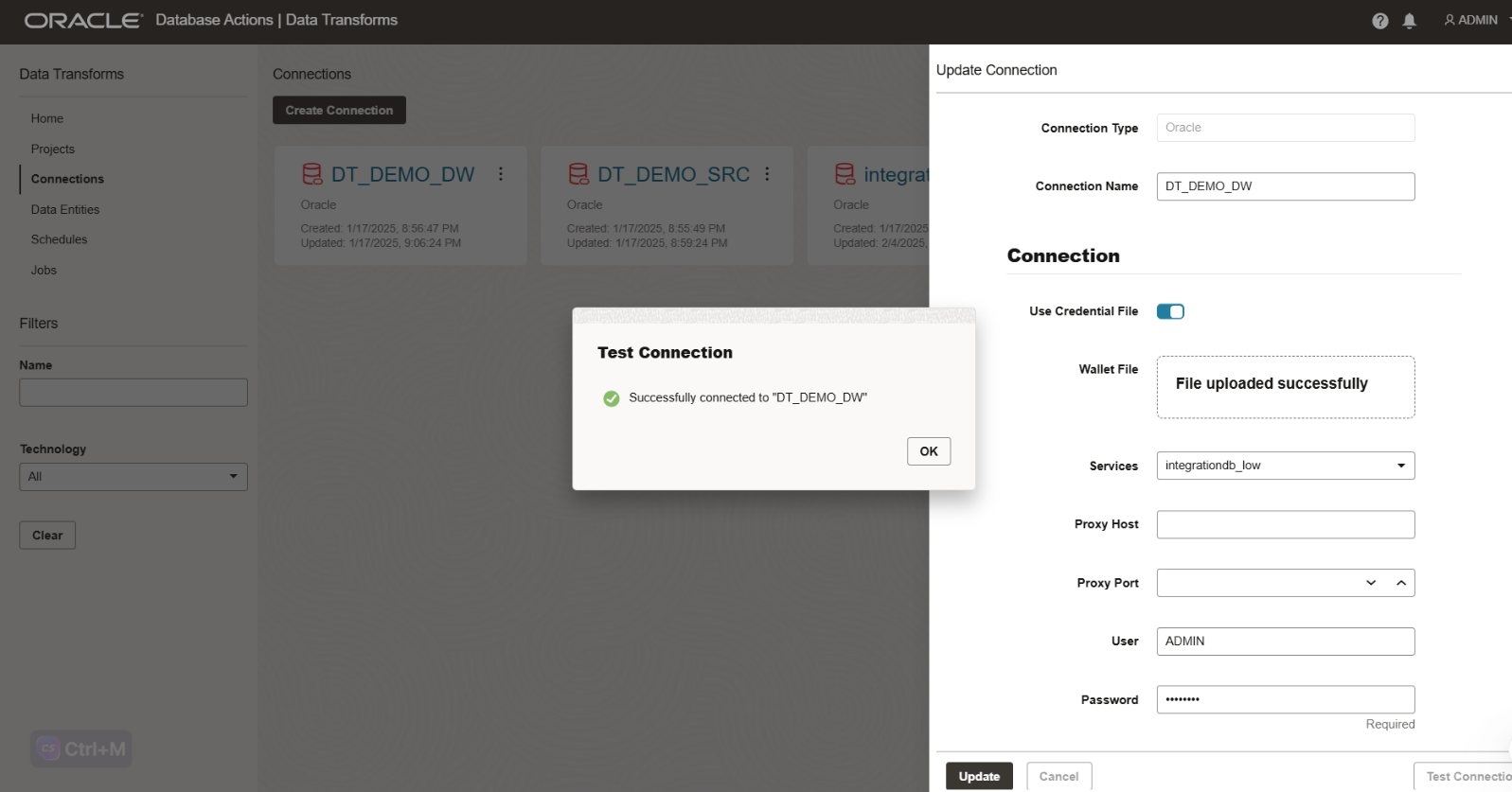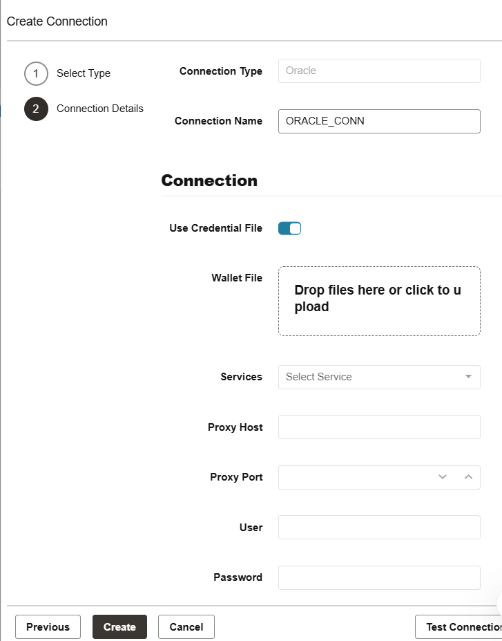 Upload the wallet for your Autonomous Database and provide connection authentication details.