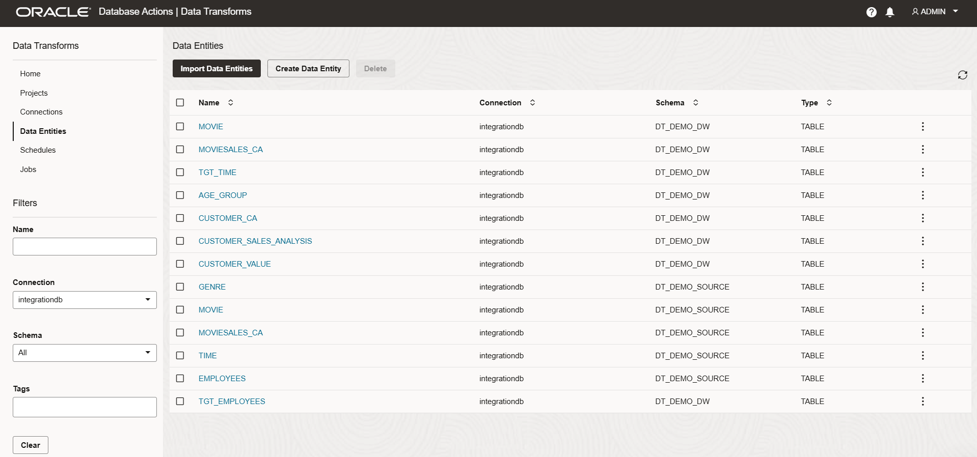 - Click Start. After the job completes, the tables from the specified schema will be available in the Data Entities menu.