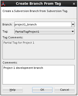 You can create a Subversion branch from a Tag. The branch creation screen lists all the relevant Subversion Tags and their respective comments to easily locate a Tag for branch