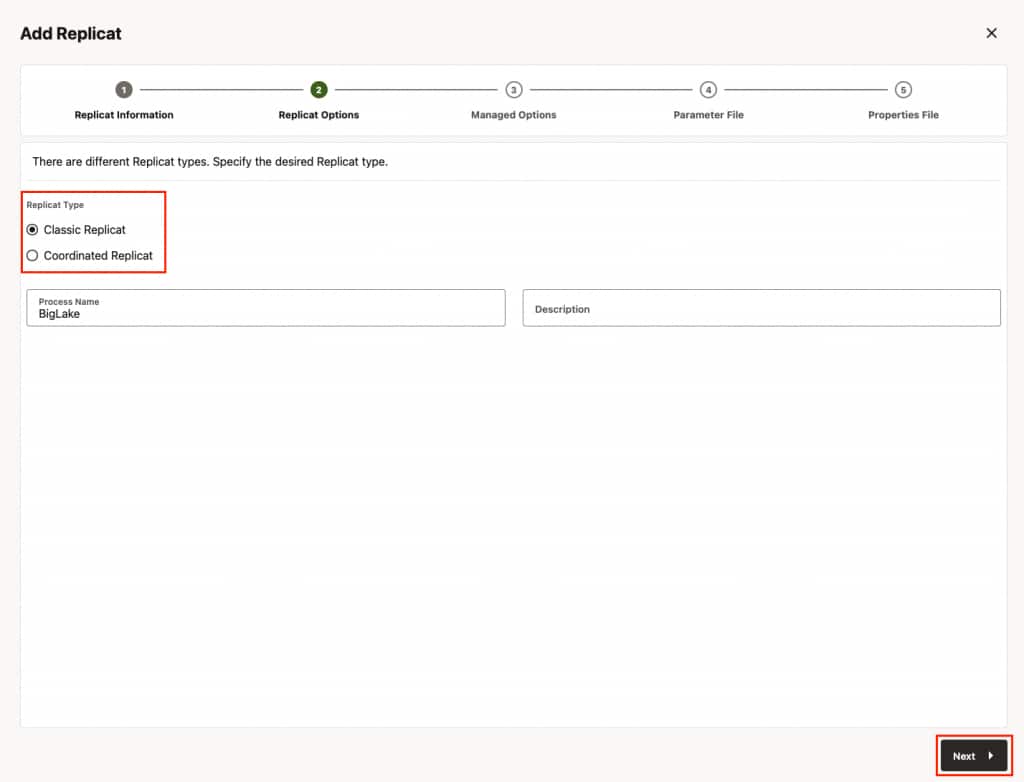 - In Replicat Information, select the type of the replicat and provide a name for the replicat and click Next.