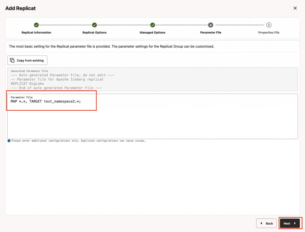 - In Parameters File, you can define source to target (Google BigLake metastore) mapping. Define the target side of the mapping as <biglake_namespace>.* which maps the source database names to target Google BigLake table namespace and creates the Apache Iceberg tables with the same source table names. And click Next.