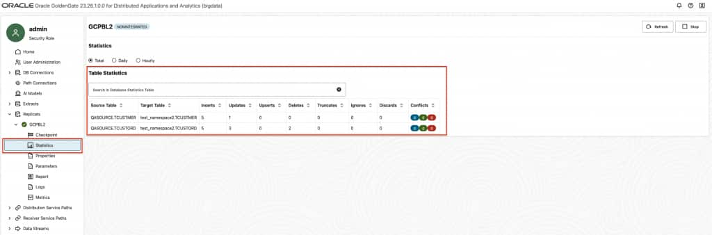 gg.handler.iceberg.inactivityRollInterval is not active by default and it is configurable. When configured, it starts a timer for tracking the inactivity period. Here, inactivity means there are no operations coming from the source system. In other words, there are no CDC data being written to the file. When set, it starts the count down when the last operation is written to a file. At the end of the count down, if there are no incoming operations, file is closed and moved to Google BigLake. Especially for dev-test scenarios, it can be very useful. For example, you can add gg.handler.iceberg.inactivityRollInterval=5s to replicat properties to set it to 5 seconds. - To confirm that Replicat is running successfully, you can check the Replicat Statistics and confirm Iceberg tables exist in warehouse path.