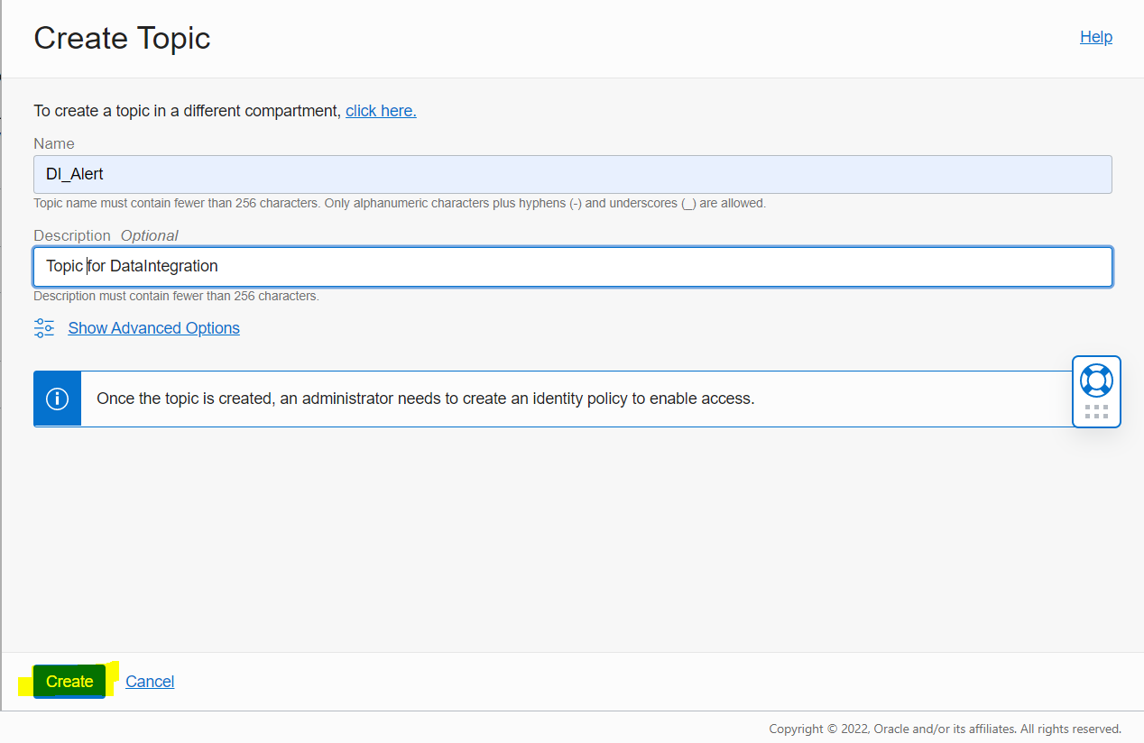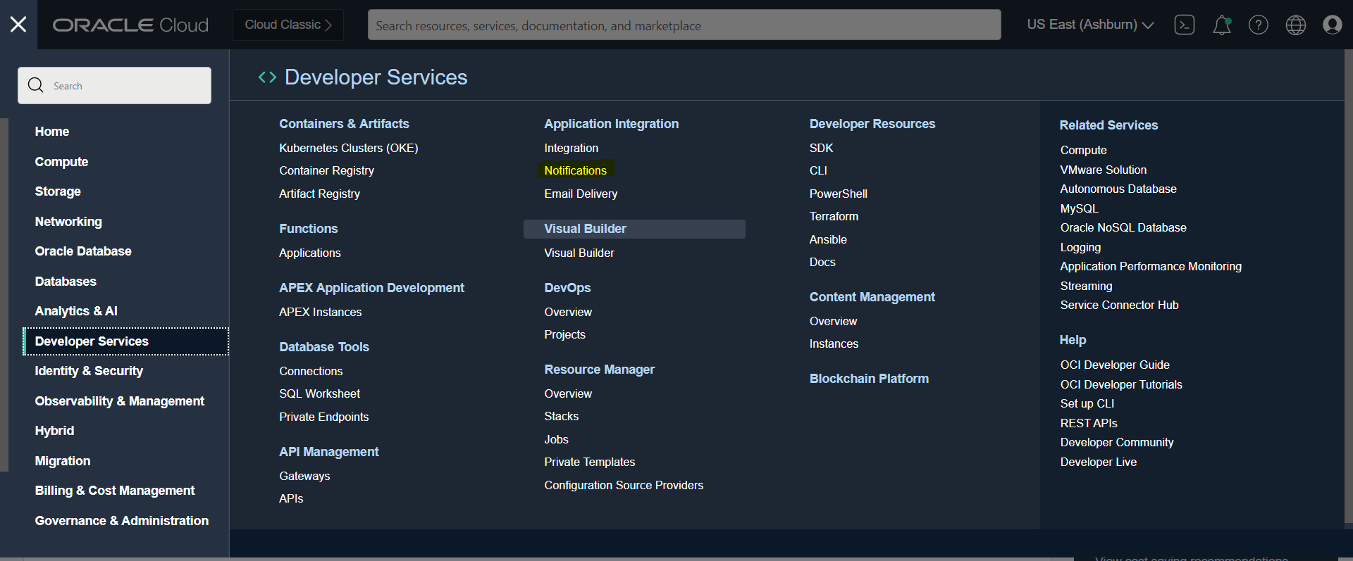 First, you will create a Notification topic. From OCI Services menu, click Developer Services -> Notifications